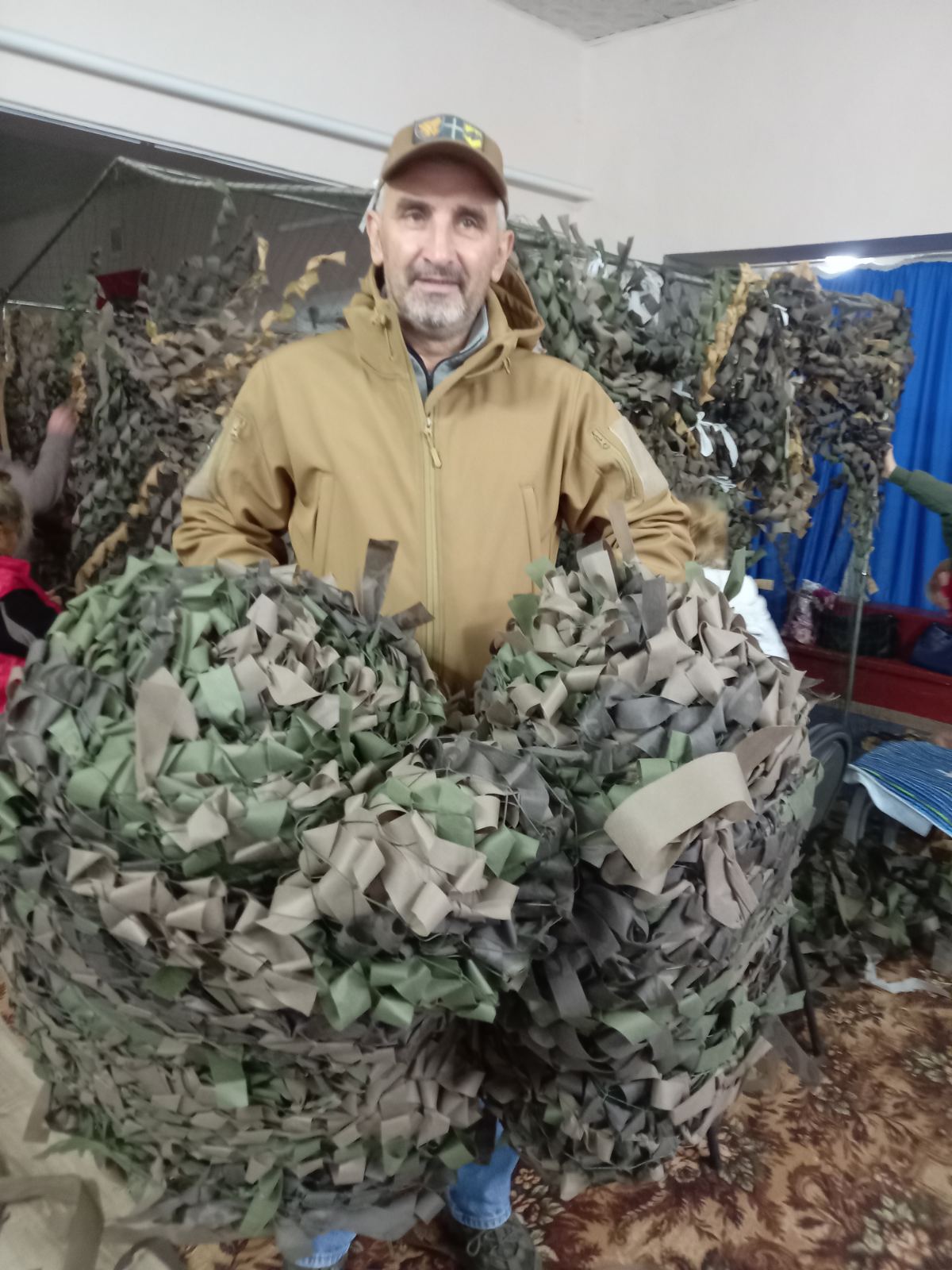 Бо треба маскувати техніку, бліндажі. Аби виконувати бойові завдання, утримувати позиції та вберегти своє життя. Ми писали, як це починалося, як у приміщенні Святецького старостату жінки зносили перкаль, старі простирадла, підковдри, старі речі, білого та темного кольору. Як все це нарізали на смужки, забирало це багато часу, а ножиці намулювали руки. Ще ж, коли плели сітки, дуже боліли, терпли руки, бо ж їх треба весь час тримати догори. Але всі терпіли, ніхто на це не зважав. З літа 2023-ого року справи пішли на краще: стали закупляти через інтернет основу для сітки та рулони спеціальної тканини – спанбонд. Нагадаємо, що це інноваційний текстильний матеріал, який виготовлюється з найтонших волокон полімеру. Його використовують при виготовленні виробів побутового призначення, спецодягу, у сфері будівництва. Але ще десь пів року ще довелося волонтерочкам розрізати його на смужки вручну, аж поки майстер на всі руки Василь Троян не зробив спеціальний станок, який тепер дуже рівно, гарно та швидко ріже рулони спанбонду.