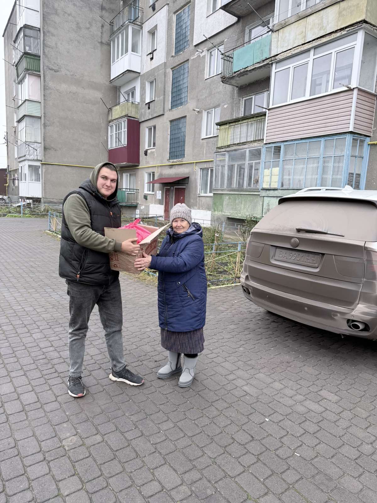 Сергій Бондарчук зафіксував на знімок момент вручення Денисом Бондаруком одного з кількох пакетів продуктів харчування для переселенки Валентині Харитонівні Заєць-Рижук