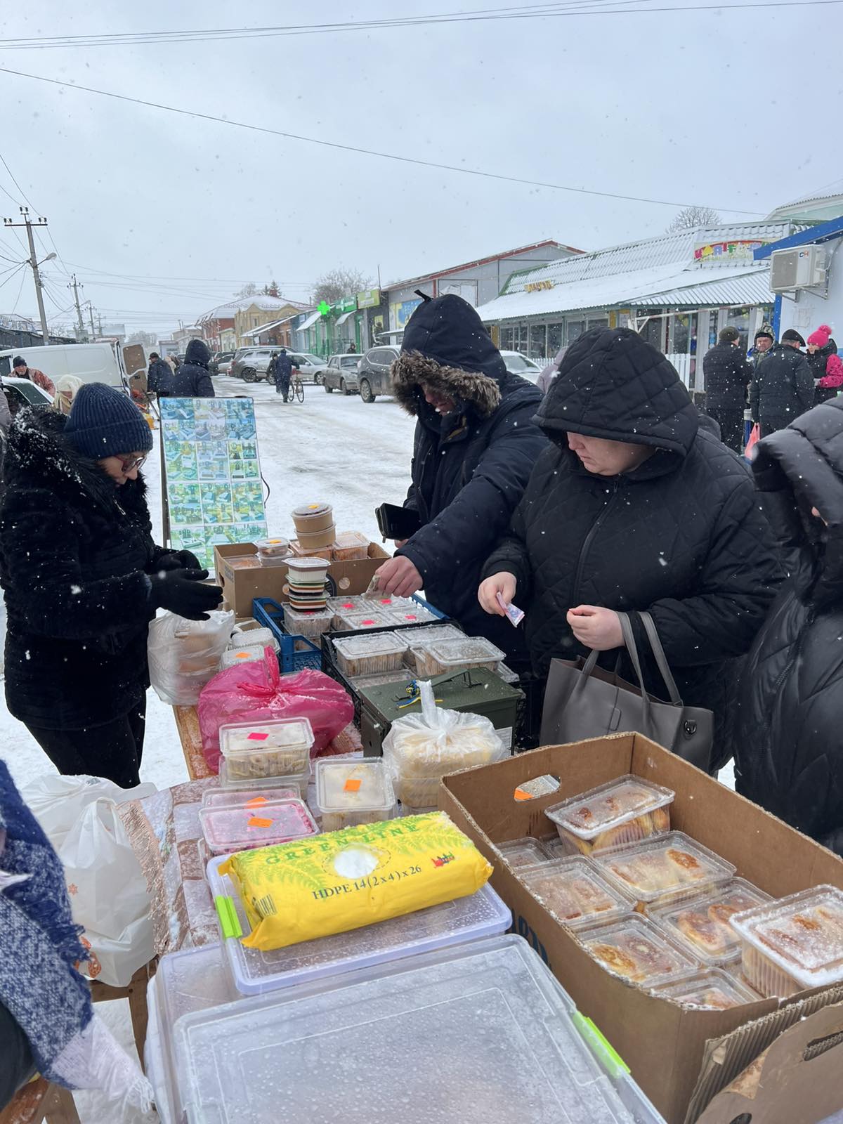 А в неділю, 28 грудня, волонтерська група Наталії Гонюк (Новоставці-Кривовілька) провели у Теофіполі благодійний ярмарок. Як завжди, наготували багато страв та солодощів. А яка цього дня була негода, хуртовина, пронизливий вітер! Тож намерзлися Наталія Гонюк, Майя Окаєвич та Олена Глов’юк.