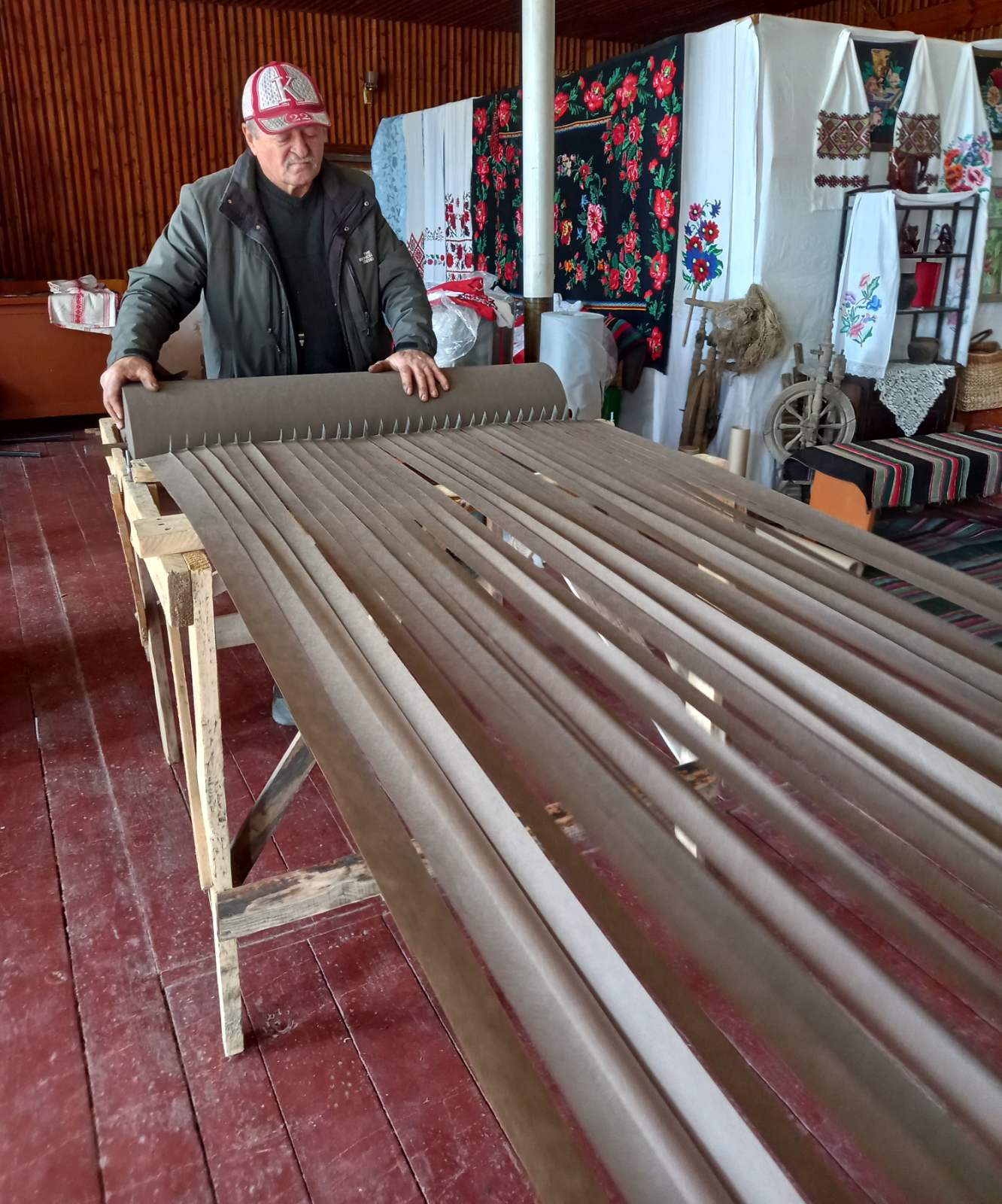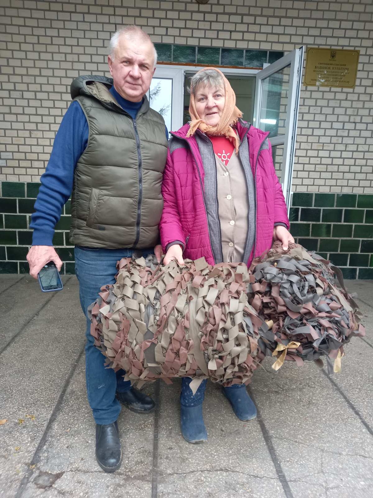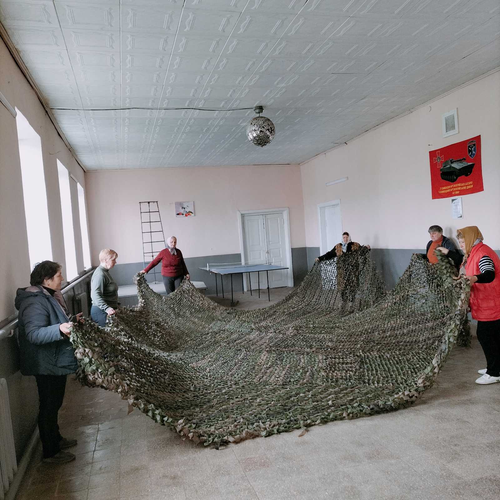 Отож, щотижня, з понеділка по п’ятницю, з дев’ятої до тринадцятої години у просторій залі Святецького сільського будинку культури ці жінки, майже всі вони пенсійного віку, плетуть маскувальні сітки. За день можуть сплести одну найбільшу сітку – 6 на 9 метрів, бо вже так наловчилися. Добре, що минув той час, коли все починалося: як у приміщення Святецького старостату всі зносили сувої перкалю, простирадла та підковдри, одяг білого та темного кольору та ножицями різали на смужки. Як це забирало море часу, як до крові намулювали руки ножицями. Ще ж не знали, де брати основу для сіток, з Кам’янця-Подільського передавав ящики з нею земляк Василь Косюк. Та з літа 2023-ого року стали через інтернет замовляти основу для сітки з міцних ниток, а також рулони спанбонду – інноваційного текстильного матеріалу з найтонших волокон полімеру. Але ще десь пів року довелося розрізати його на смужки вручну, аж поки місцевий майстер Василь Троян (чоловік директора Святецького сільського будинку культури Ірини Троян) не змайстрував спеціальний станок, який дуже швидко (за годину ріже три сувої, це дев’ятсот метрів), рівненько ріже спанбонд. Звісно, у всіх, хто плете сітки, болять, терпнуть руки, адже їх постійно треба тримати догори. Та ніхто на це не зважає, терплять, бо роблять це за покликом душі, аби наступила перемога, довгожданий мир, аби припинилася ця страхітлива війна.