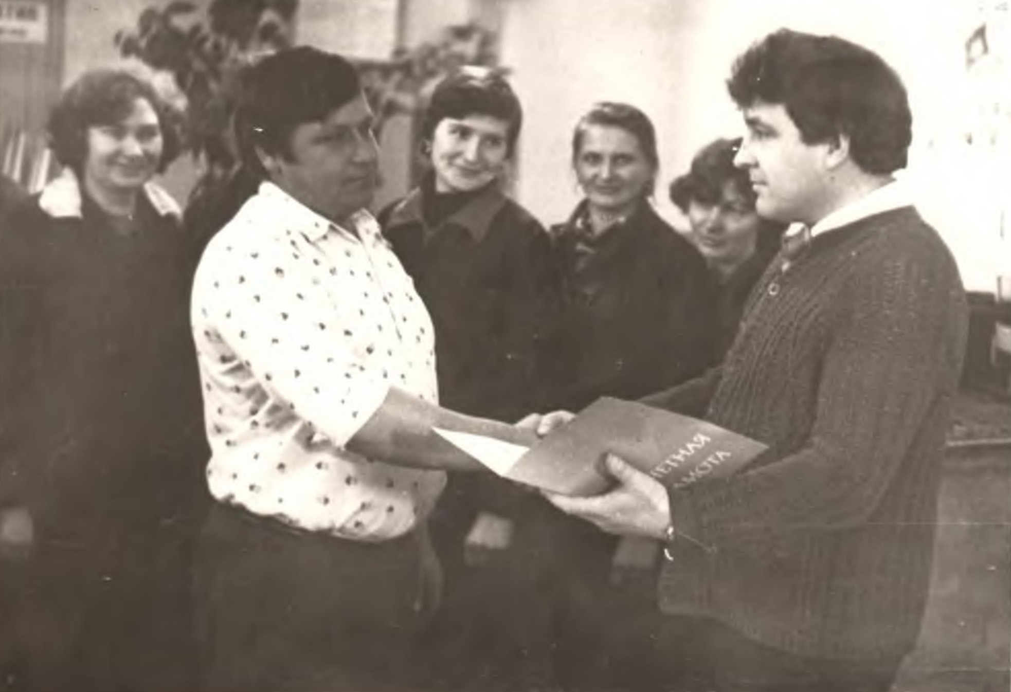 Даруйте, шановні, але ми трішечки відхилились від основної теми – поліграфії. Так ось, вище згаданий друкар Микола Черній за роки роботи виховав не одного свого послідовника у цій професії. Серед них – і Світлана Карпова, і Вікторія Кириленко, і Петро Довганюк. Микола Петрович був неодноразовим учасником обласних конкурсів-оглядів на кращого за професією, посідаючи там не останні місця серед колег. А ось на цьому знімку я вручаю М. П. Чернію Почесну грамоту вже за багаторічну бездоганну працю. Радіють за нього – дружина, лінотипіст Марія Черній, складачі ручного набору Ольга Квасюк і Людмила Цвігун, друкар Євгенія Тримуд. Тут похвалюся, що десь через десяток з лишком років Ольга Іванівна Квасюк стала моєю щирою свахою, а для моєї доньки Наталі – доброю і ніжною свекрухою.